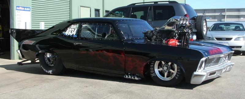 Drivers: Ben Hoar Ben started drag racing in Super Street driving "Trusty" the HT Ute of Wayne Batson. In 2012 Ben purchased the Wally Stroupe built Pro Modified 70 Chevy Nova from the USA intitially for Super Sedan competition. Ben has now stepped into the Supercharged Outlaws Bracket with the Nova getting a few changes. The 565 cube carby Big Block Chevy has been replaced with an 525 cube AJ481X Pro Mod style motor with custom steel connecting rods. Powerglide is replaced with the ever reliable Bruno Drive and 3 speed CS1 Lenco. Rear end was replaced with a Strange Engineering Ultra 4 link diff assembly. In licencing the car ran 6.61 at 218 mph. |